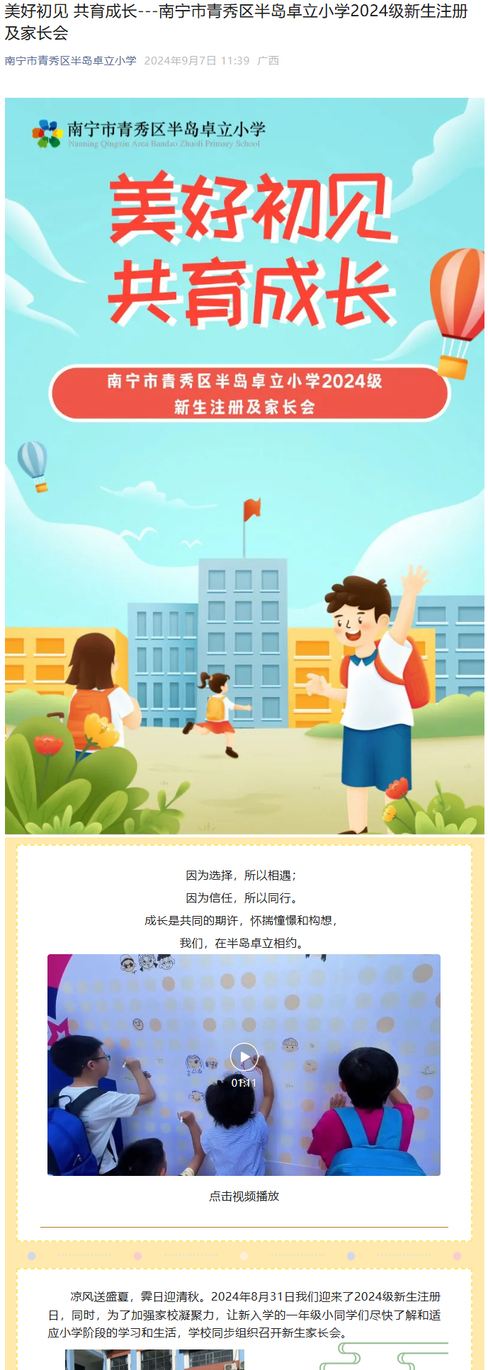美好初见 共育成长---南宁市青秀区半岛卓立小学2024级新生注册及家长会