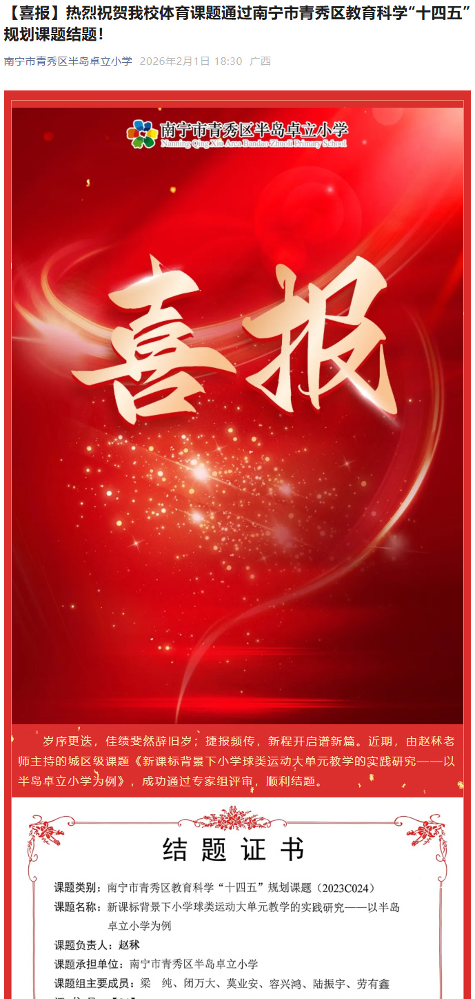 【喜报】热烈祝贺我校体育课题通过南宁市青秀区教育科学“十四五”规划课题结题!