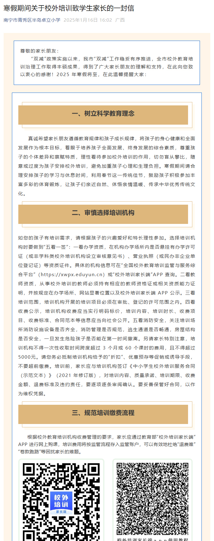 寒假期间关于校外培训致学生家长的一封信