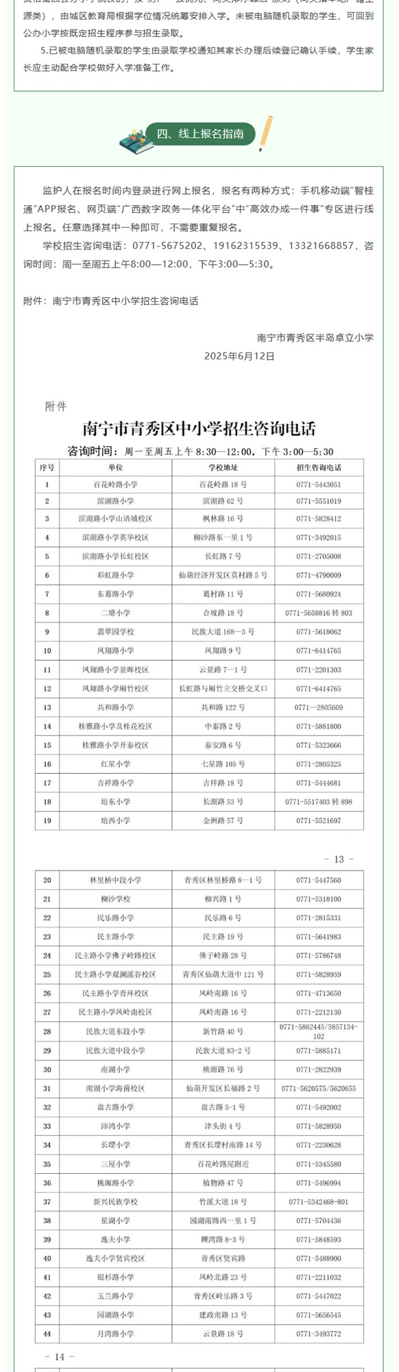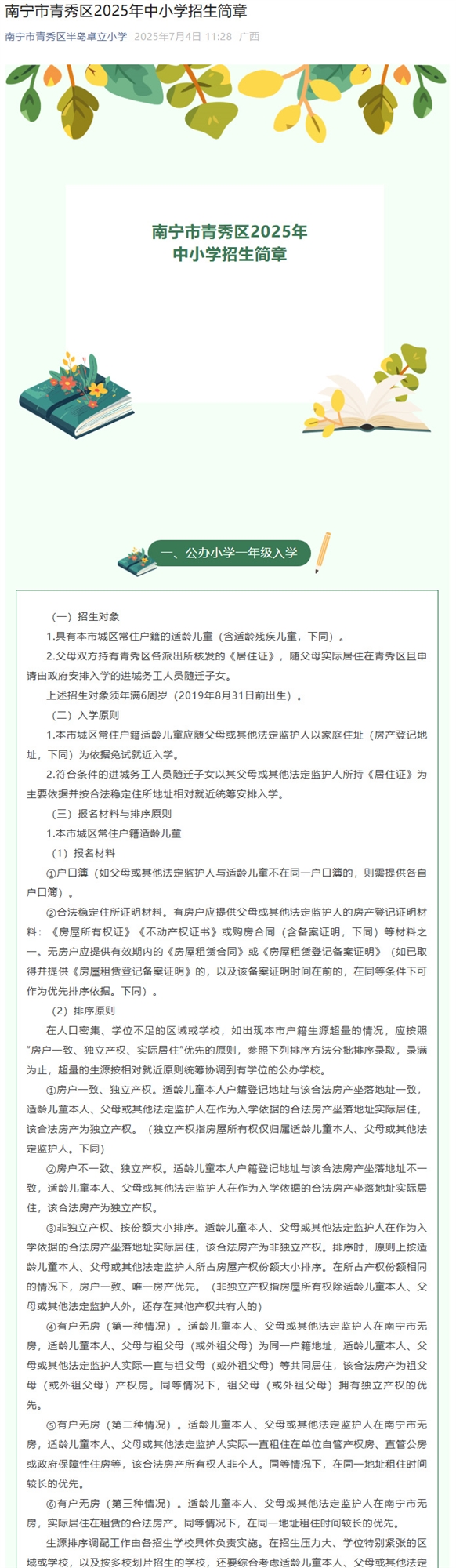 南宁市青秀区2025年中小学招生简章