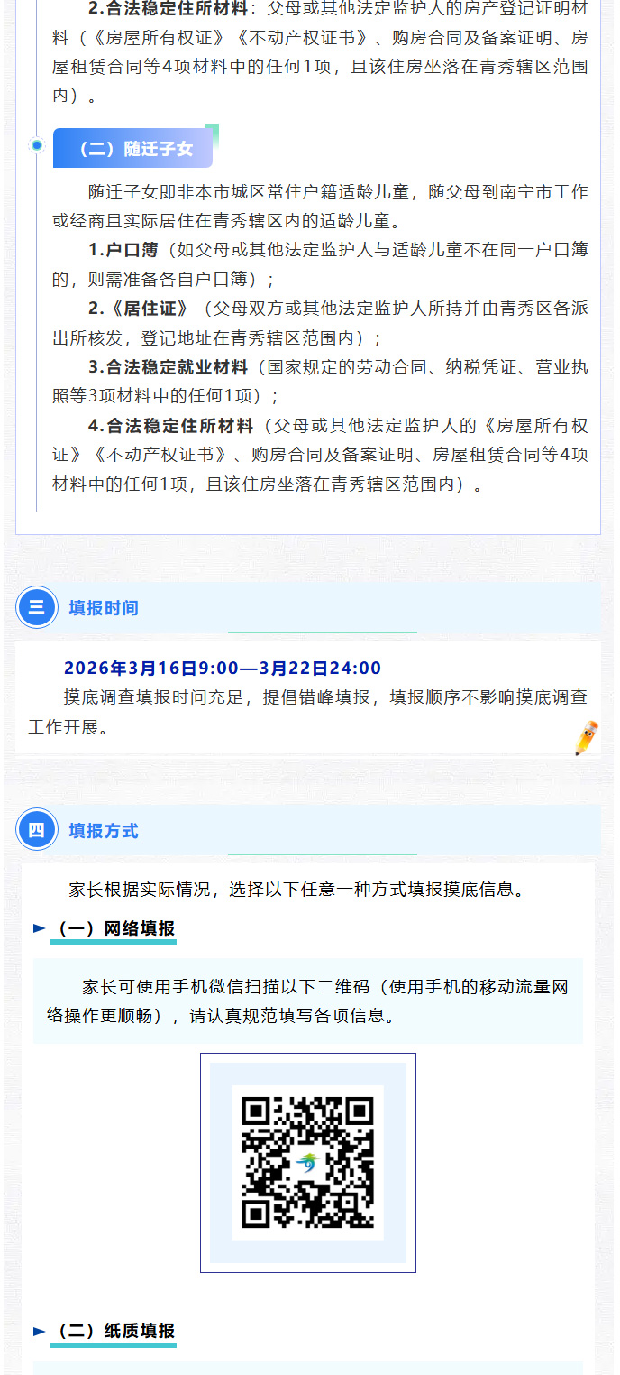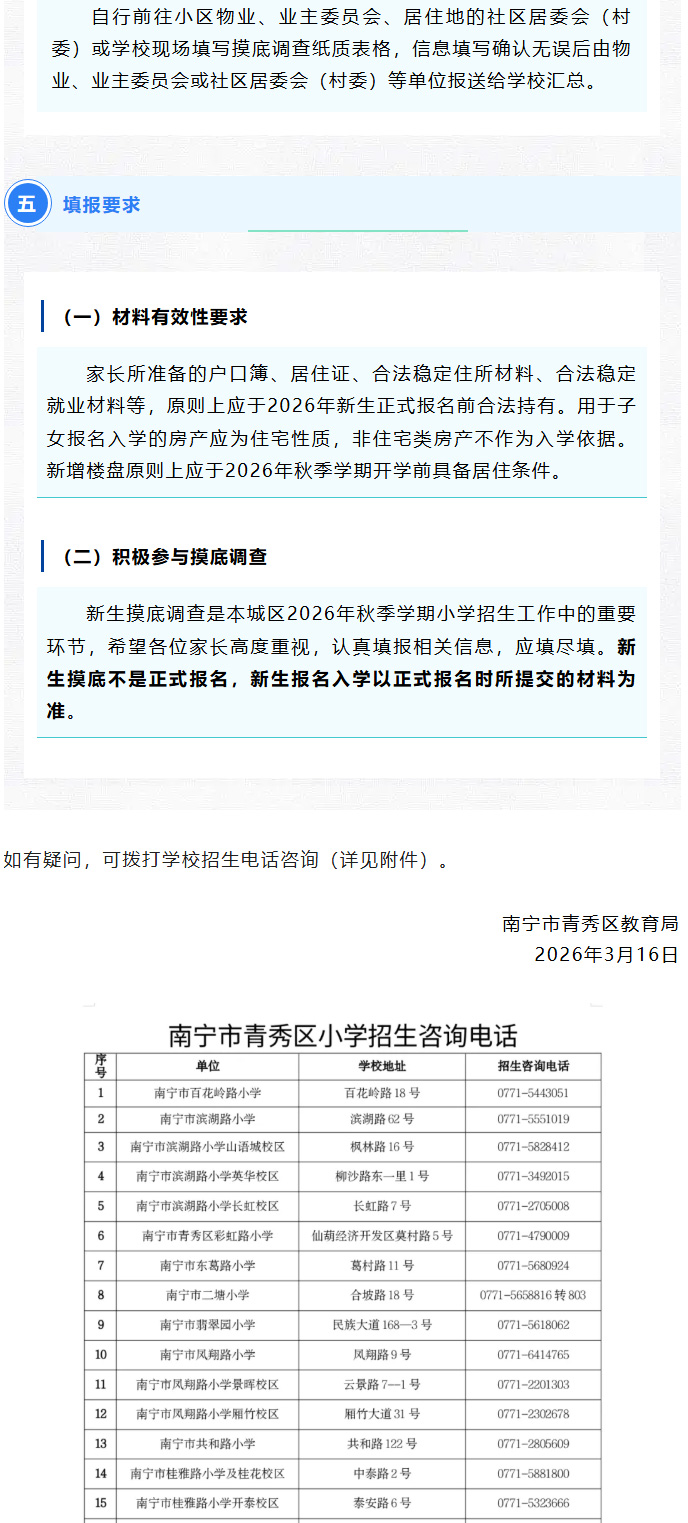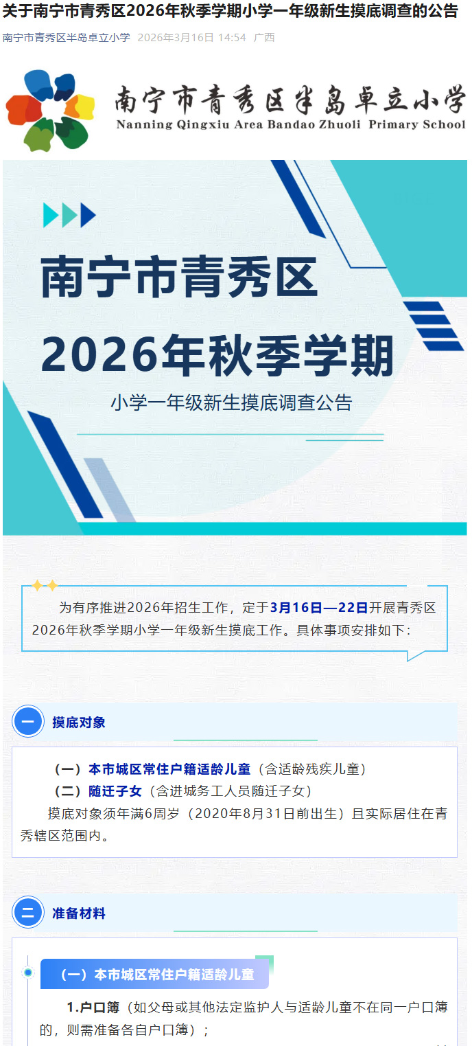关于南宁市青秀区2026年秋季学期小学一年级新生摸底调查的公告